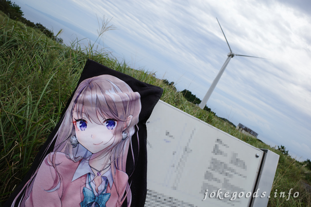 そして次は場所を移動して風車の見える丘へ!案内看板に引っ掛けて記念撮影をしてみました。