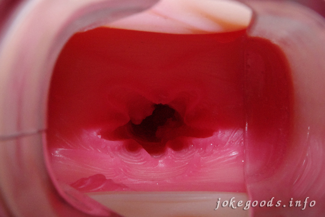 それではローションを装填して挿入してみましょう。内部は基本ヒダですが、幾何学模様という感じなので不規則にヒダの感触が竿を襲う感じです。また肌に当たる層はやや硬めの素材が竿をしごいてくれますし、外側の硬い素材が厚く存在ししっかり圧迫していますので高刺激タイプのオナホという感じです。