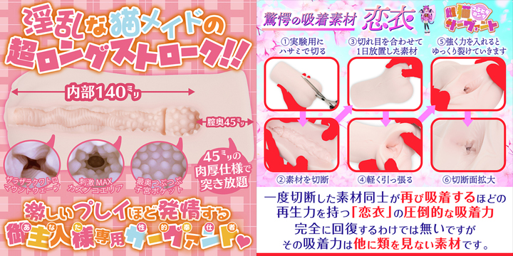 まずはハンドオナホの「maccos 雌猫サーヴァント」です。新素材「恋衣」をふんだんに使用した870gの重量級ボディは纏わり付く「恋衣」の感触を存分に楽しめそうです。写真を見ての想像ですが、結構いい感じの気持ち良さが期待できます。