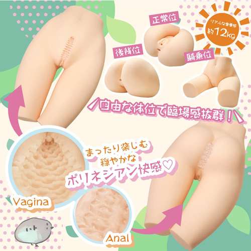 「昼下誘惑体験(シエステンプテーションエクスペリエンス)」はヘソ下から脚の一部分迄が付いた尻オナホといった雰囲気の製品で、重量は約12kgです。二穴仕様で脚の付け根には関節もあり、体位によって脚の向きを変えられます。