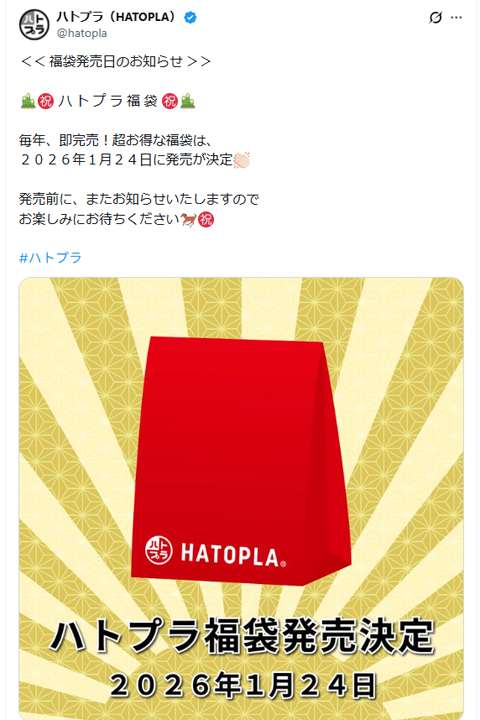 毎年人気のハトプラ福袋ですが、2026年版の発売は2026年1月24日となりました。2025年版は2024年12月24日発売でしたが、来年のお楽しみということになりそうです。