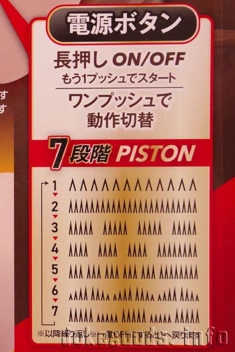 以降1プッシュごとにピストンの動作が変わりますが、個人的には2が一番グイグイ来る感じで気に入りました。7パターンで好き嫌いは人それぞれだと思いますが、個人的には動きが一瞬止まる溜めのあるモードより、グイグイ来る1や2のモードが好みです。