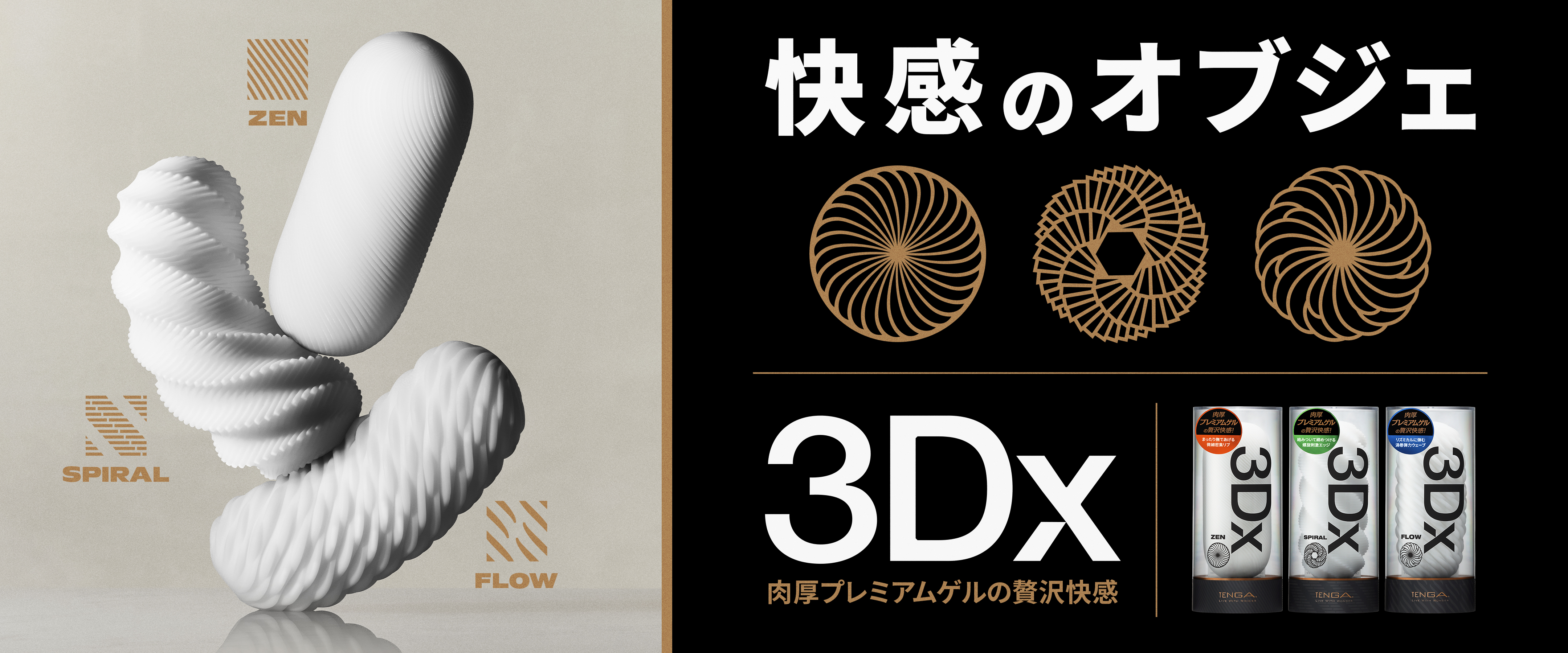 TENGAから「TENGA 3Dx」が発売になりました。内部構造違いでZEN、SPIRAL、FLOWの3種類があります。従来製品「TENGA 3D」が約1.7倍のゲル量になった贅沢仕様です。