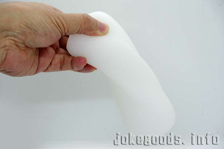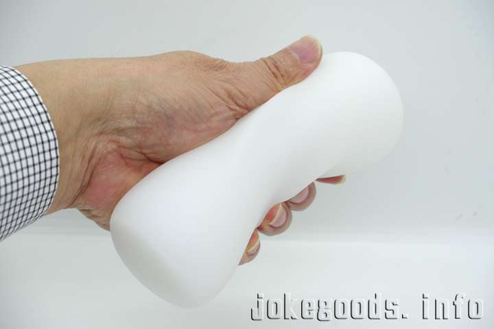 オナホ本体は約310g、素材の硬さは硬めの+2程度の硬さです。硬め素材ということもあると思いますが、匂いやベタつきの少ない素材が用いられています。またフラットではない外部形状も実際に握ってみると握りやすさを考慮した形状であることが分かります。