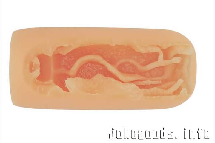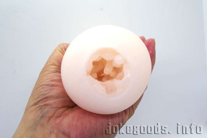 ミミズ状のピロピロした突起は手前だけで、奥側は高さあってしなる湾曲した縦ヒダです。比較的締め付けが緩い入口側では撫でる様な感触、キュッと締まる奥側では亀頭を締め付ける様な快感があります。